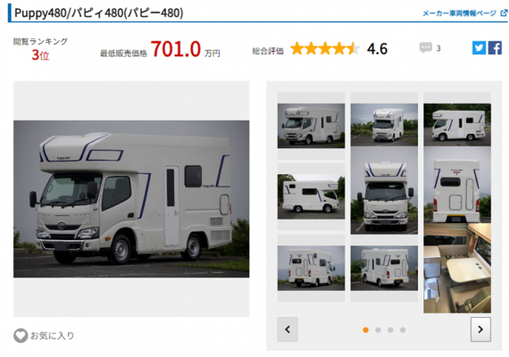 当サイトは、これからキャンピングカーの購入を検討されている方へ向けた日本最大級のキャンピングカーの比較サイトです。国内・海外を含む850台以上のキャンピングカーを、価格や車両サイズ、就寝人数やオプション装備など、約60種類の項目からスペック比較ができ、どのキャンピングカーが人気かを一定期間の閲覧数を基にランキング形式で表示。
