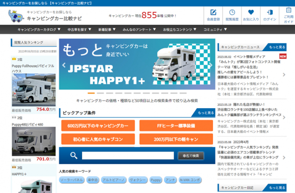 国内で販売されているキャンピングカーのスペックやオーナーなどによるクチコミ評価を比較できる情報サイト「キャンピングカー比較ナビ」を運営するキャンピングカー株式会社(本社:東京都渋谷区、代表取締役:頼定 誠)は2023年6月5日、「キャンピングカー比較ナビ」内で人気のあるキャンピングカーの閲覧数ランキングを発表いたしましたので、お知らせいたします。