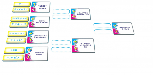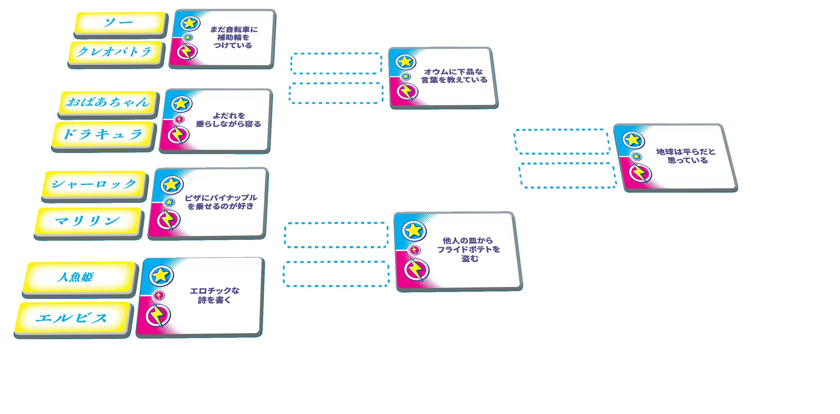 このゲームでは、「クレオパトラ」「人魚姫」「おばあちゃん」などの自分たちで考えた8人のキャラクターをトーナメント形式で対決させていきます。