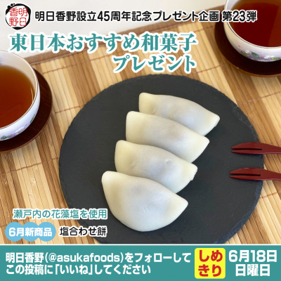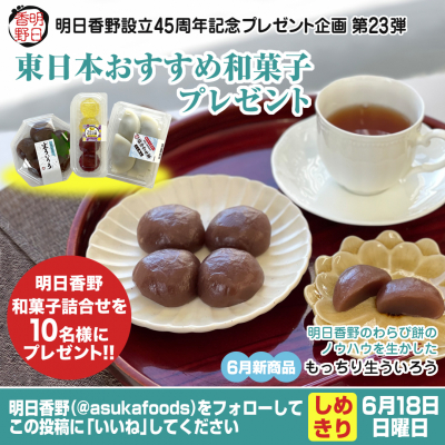今回のキャンペーンでは明日香野東日本の人気和菓子をセットにして合計10名様にプレゼントいたします。