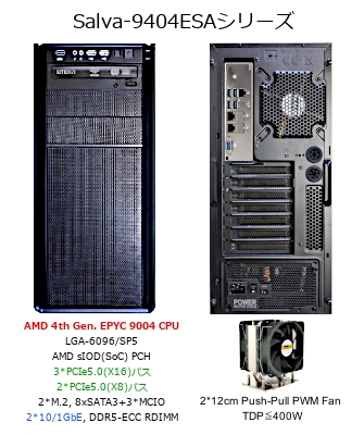 Salva 9404ESAシリーズは、LGA6096ソケット(ソケットSP5)の第4世代AMD EPYC 9004 CPUを搭載したシステムで、3.5インチと2.5インチのレール式ドライブベイを各4ベイ装備しています。換気性能を重視したメッシュ仕様のフロントパネル、天板および側面のベンチレーション、400WまでのCPU発熱に対応するプッシュプル方式CPUクーラーを採用し、筐体内の熱滞留を極力抑えた空冷システムです。