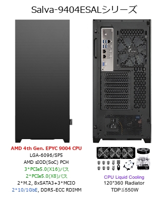 Salva 9403ESALシリーズは、LGA6096ソケット(ソケットSP5)のAMD Zen4 EPYC 9004 CPUを、3台の12cm PWMファンと360mm x 44mmラジエーター、流量600L/時のポンプで構成される550W冷却システムで冷却し、Boost Clock 動作時のCPUからの発熱にも対応した静音システムです。