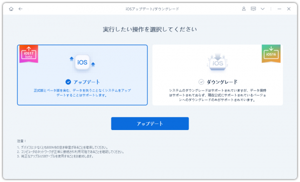 Step2:お使いのデバイスをPCまたはMacに接続し、左のアップデート項目をタブして、「アップデート」ボタンをタブします。