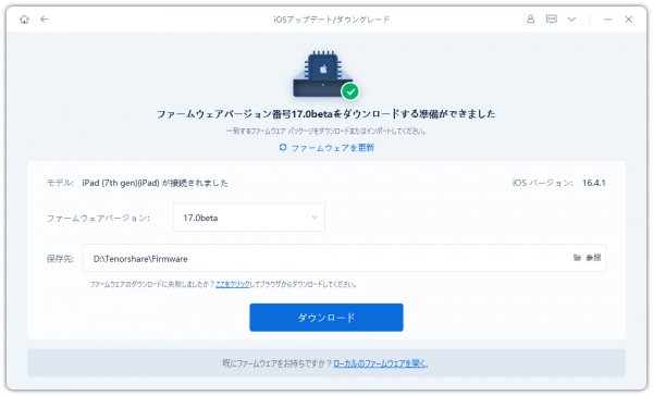 Step3:ReiBootが自動でアップデート可能なiOS 17ベータ版のファームウェアが表示されます。「ダウンロード」をクリックして、ファームウェアパッケージを読み取ります。