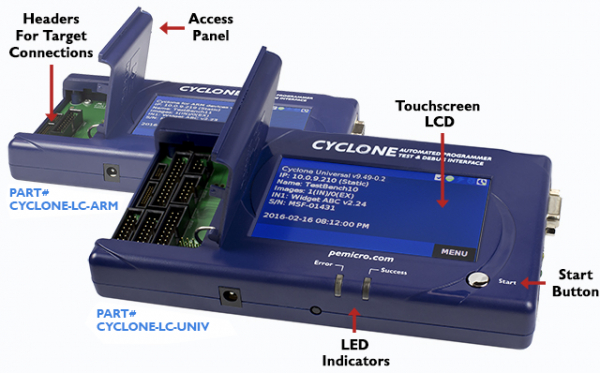PEmicro Cycloneプログラマは、スタンドアロンモードで動作するように設計された高度なプロダクションプログラミングツールです。PEmicroのイメージ作成ユーティリティは、これらのスタンドアロンプログラミングイメージを生成します。アルゴリズム、バイナリ、バイナリの消去、プログラム、検証を含むプログラミングスクリプト、およびシリアル番号、動的データ、テストコマンドの実行、プログラミング用のデータの保存などの他の機能とともに、より複雑なスクリプトを組み合わせることができます。