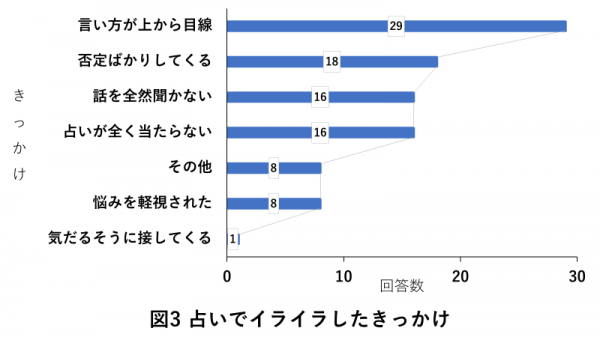 事前調査同様、占いでイライラしたきっかけについては、「言い方が上から目線」との回答が最も多く選ばれていました。