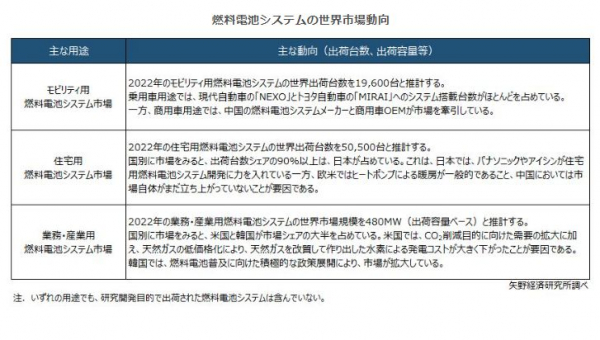 株式会社矢野経済研究所(代表取締役社長:水越孝)は、燃料電池システム及び関連部材の世界市場を調査し、水素・燃料電池関連の各国政策や、用途別市場、関連部材、メーカー各社の動向を明らかにした。ここでは、主な用途であるモビリティ用、住宅用、業務・産業用燃料電池システムの動向について、公表する。