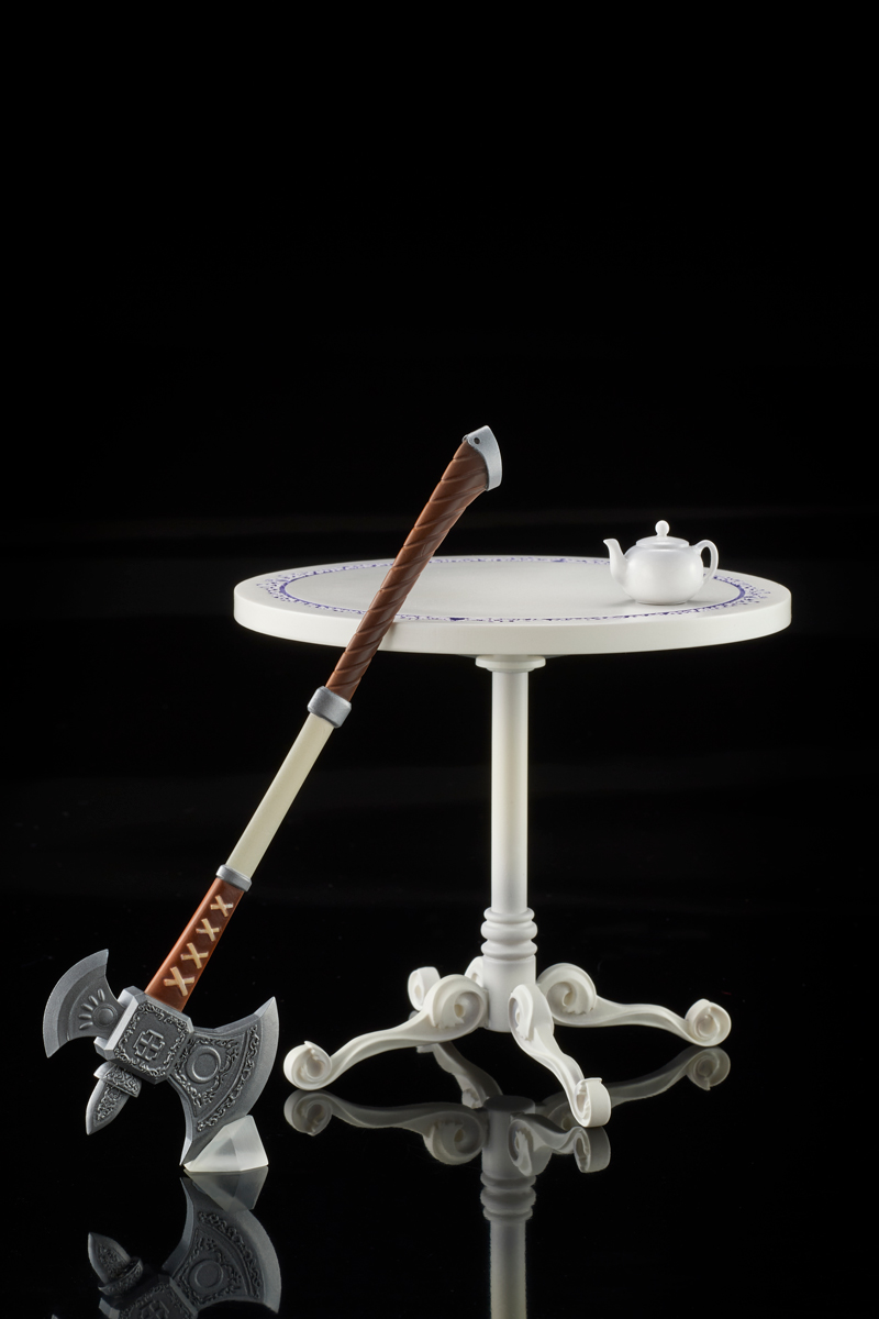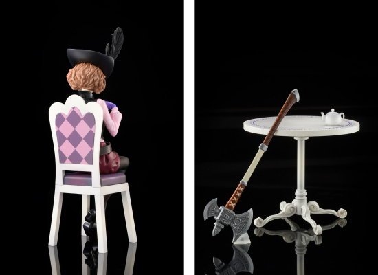 総攻撃のカットシーンで見せる佇まいを、机やティーカップ等の小物に至るまで丁寧に再現しました。