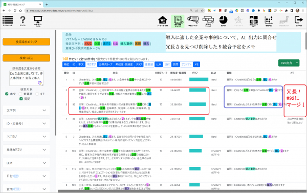 上記の問題を解決するため、メタデータ株式会社は、“AI冗長出力オーガナイザ”https://metadata.co.jp/services/ai-redundancy-organizer.html を開発しました。“AI冗長出力オーガナイザ”は、ChatGPT、Bard、Bingなどの多量の文章生成AIの出力を統合し、整理するツールです。このツールにより、類似度でランキングした出力の上位に集まった文章間の冗長性を、自動で色づけられたものをチェックし、不要な出力を削除したり、一部をメモ欄でコピーアンドペーストして統合・整理したりすることができます。