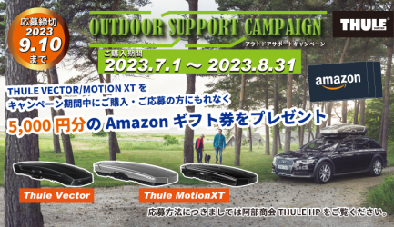 株式会社阿部商会(本社:東京都千代田区、代表取締役:阿部 文保)は、「THULE OUTDOOR SUPPORTキャンペーン」を7月1日より開始いたします。 キャンペーン期間(2023年7月1日~2023年8月31日まで)に対象のルーフボックスTHULE VECTORシリーズ/MOTION XTシリーズをご購入の上、2023年9月10日までにご応募いただいたエンドユーザー様全員に、AMAZONギフト券(Eメールタイプ)5,000円分をプレゼントいたします。