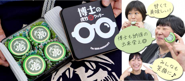 また、クッキーのデザインは虎斑竹をイメージし、断面を表現しています。竹の身部分を黄色で、竹の表皮を緑色でデザインし、中央部分には竹虎のロゴマークがあしらわれています。さらに、クッキーは可愛らしい缶に12個入っており、缶のデザインには博士の眼鏡がモチーフとなっています。