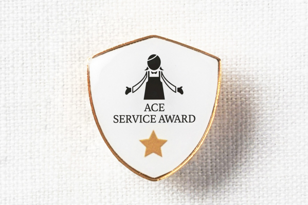 最終審査出場者は店頭にて、「ACE SERVICE AWARDバッジ」を着用しています。お客様へ食を通じた「幸せ時間」を過ごすお手伝いができるプロフェッショナルの象徴です。バッジを着用したスタッフへお気軽にお声がけください。