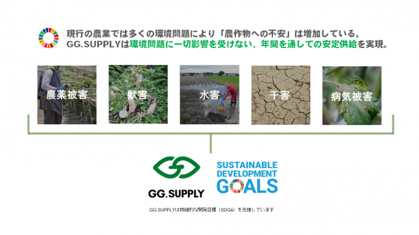 現行の農業では多くの環境問題により、「農作物への不安」は増加しております。GG.SUPPLYは環境に一切影響を受けない、年間を通しての安定供給を実現しております。
