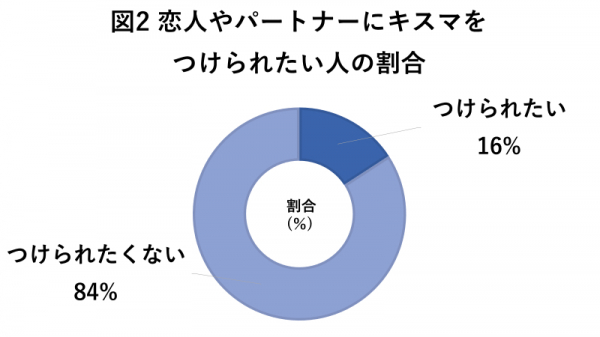 恋人やパートナーからキスマをつけられたいという方は16%に対し、つけられたくない方は84%。キスマをつけられたい方よりもつけられたくないと感じる方が多い結果となりました。