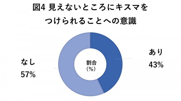 アンケートにて回答を求めた結果、元々キスマをつけられたくないと回答した方のうち、およそ4割が「アリ」と回答。「見えるところは嫌だけど、見えないところなら大丈夫」と思う方も一定数いることが明らかとなりました。