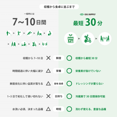 私達が毎日口にしている野菜は、収穫から10 日以上も経過していると言われています。食卓に運ばれるまでの工程で栄養素が失われるだけでなく、多くの雑菌に触れています。GG.SUPPLY はそんな現代の野菜物流の課題を解決するべく、郊外から都会に畑を持ってくることにより、収穫から30 分以内に野菜をデリバリーを可能にしました。