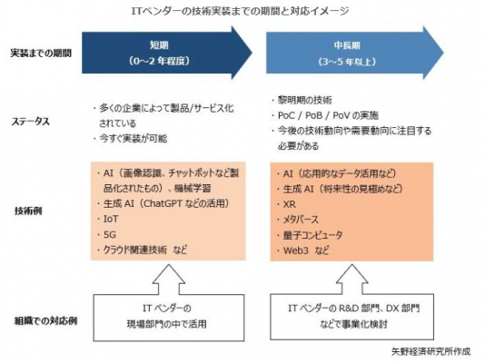 実装までの期間が短期に相当する技術には、AI(画像認識、チャットボットなど製品化されたもの、機械学習など)、IoT、5G、クラウド関連技術などがある。ITベンダーにおいては、既に製品・サービス化されたものを購入して利用することができる。