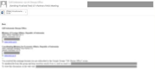 サンプル1はスピアフィッシング・メールです。脅威アクターはメールに、StartIEを埋め込んだ悪意のあるテンプレートを含むMicrosoft Word文書を添付していました。このWord文書は、先日広島で開催されたG7サミットに関連する内容のデコイでした。