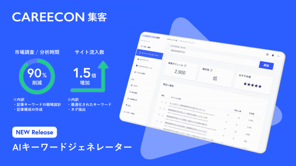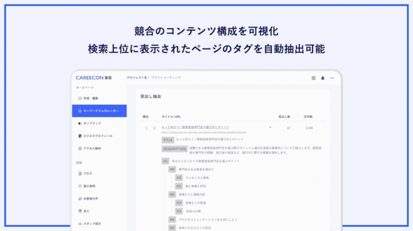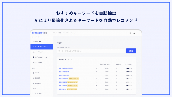そこでブラニューは、記事や施工事例などのコンテンツ作成におけるSEO対策の自動化を目的に、「CAREECON 集客」にSEOキーワードの自動選定や検索上位記事がどんな構成なのかをチェックできる、AIキーワードジェネレーターを標準機能として実装しました。