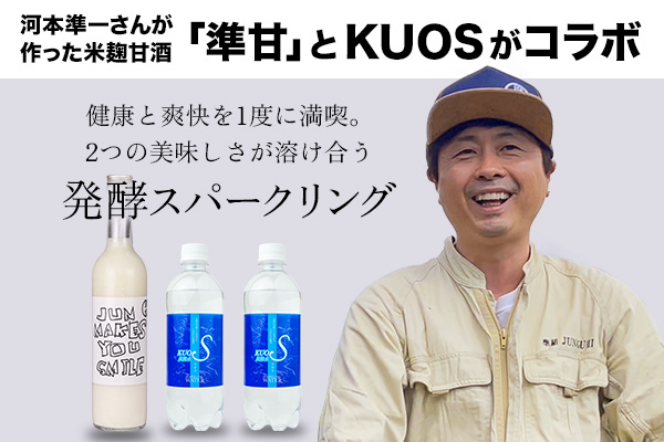 米の粒感を残したしっかりとした味わいとコクがありながらも、砂糖は使わず米麹の自然な甘みだけで作り上げたすっきりとした味わいが魅力の米麹甘酒『準甘』と強炭酸水「KUOS」で割れば、弾ける爽快な飲み口に変わり、新感覚の米麹甘酒スパークリングがお楽しみいただけます。