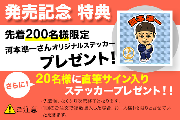 発売記念特典として、ご購入いただいた方に、先着200名様に河本準一さんオリジナルステッカーをプレゼント!さらに先着で20名様には河本準一さん直筆サイン入りステッカーが付きます!!