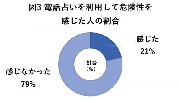 電話占いを利用したことのあるユーザーのうち、危険性を感じたという方は21%。一方で、危険性を感じなかったユーザーは79%みられました。