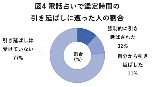 電話占いに対する危険性同様、鑑定時間の引き延ばしに遭ったという回答は少数派。実際に強制的に鑑定を引き延ばされることはケースとしては少ないように伺えました。