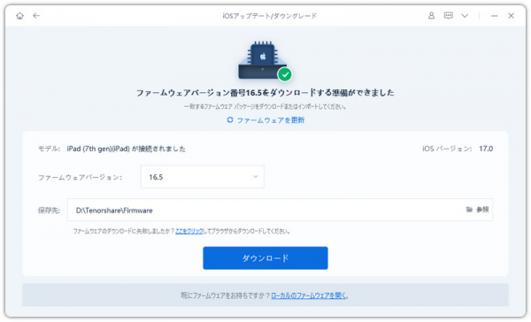 Step 2、「ダウングレード」項目をタブしします。「ダウンロード」をクリックして、ダウングレード可能なiOS16ファームウェアを読み取ります。