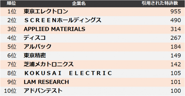 集計の結果、2022年に最も引用された企業は、1位 東京エレクトロン、2位 SCREENホールディングス、3位 APPLIED MATERIALSとなりました。