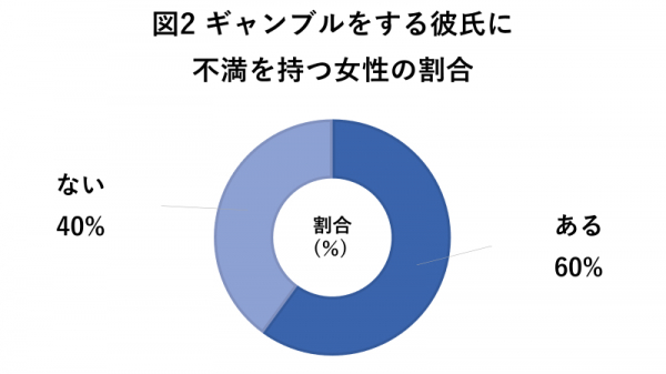 ギャンブルをする彼氏を持つ女性のうち、不満を持っている方は60%に対し、不満を持っていない女性は40%みられました。