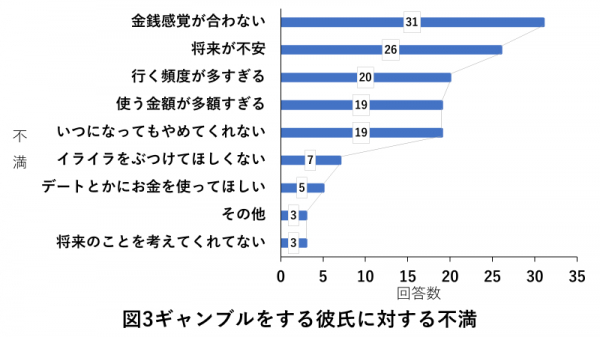 ギャンブルをする彼氏に対して不満を持っていると回答した女性を対象に、具体的な不満の内容について回答を求めました。