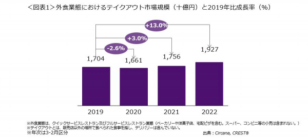 2022年の外食業態テイクアウト市場は、2019年比約13%増の1兆9267億円