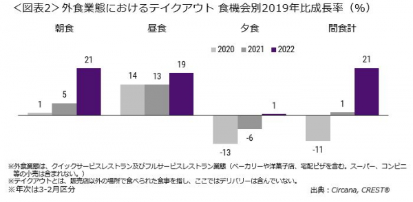 2022年の外食業態におけるテイクアウト市場を食機会別にみると、2019年比での成長率は(図表2)、夕食を除くすべての食機会で20%前後伸長しました。その一方で、夕食は、回復基調にはあるものの、19年比1%増に留まっています。
