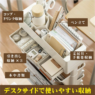 【小物入れ】ペン立て、文房具、手帳、引き出し×3、コップやドリンク、ティッシュ。