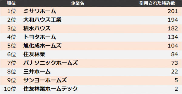 ハウスメーカー業界の被引用件数上位10社のランキング