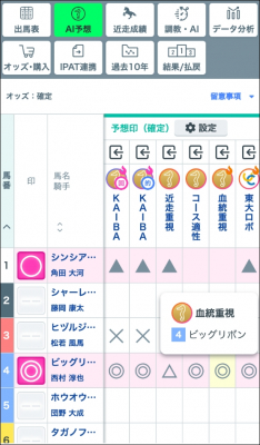 AI予想ページでは、どの出走馬に AI予想家による印が多くついているかやAI期待度などもご確認いただけます。今回のリニューアルでは、これまでの AI予想ページと異なり AI予想印がすぐ見られる位置に表示されるように改善いたしました。