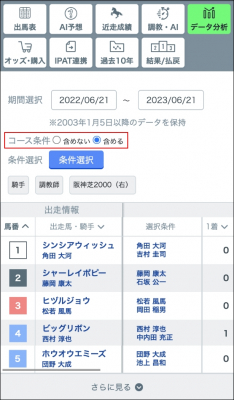 今回の改善で、デフォルトでコース条件を「含める」にすることで予想したい内容(条件)により近いデータの確認が可能になりました。