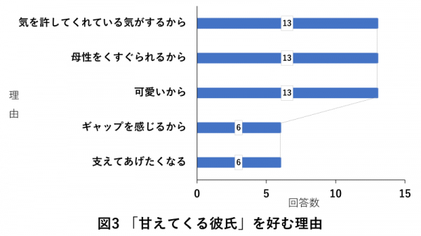 「甘えてから彼氏」を好む理由として、「気を許してくれている気がするから」「母性をくすぐられるから」「可愛いから」という理由が上位に挙げられていました。