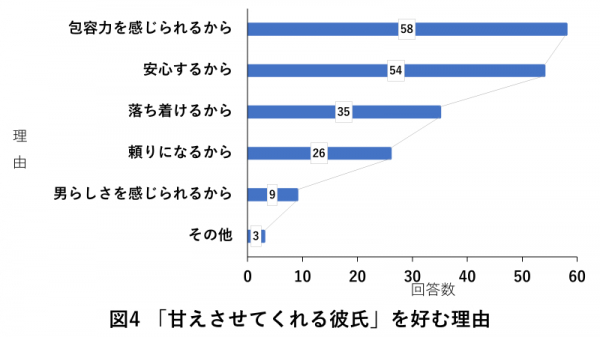 一方、「甘えさせてくれる彼氏」を好む理由としては、「包容力が感じられるから」との理由が最も多く選ばれていました。