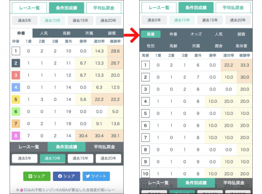 新たに 馬番・オッズ・性別・厩舎・馬体重 の5項目を追加したことにより、過去のデータから更に詳しい条件下での1~3着・着外の数、勝率・連対率・複勝率を確認することが可能になりました。
