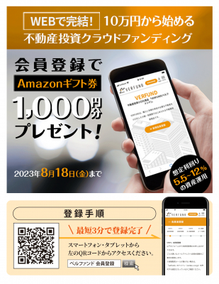 総合不動産事業を展開する株式会社ベルテックス(所在地:東京都新宿区、代表取締役:梶尾 祐司)は、不動産投資型クラウドファンディング『VERFUND(ベルファンド)』(https://verfund-invest.com)』にて『会員登録キャンペーン』を2023年6月26日(月)から8月18日(金)まで開催することをお知らせいたします。