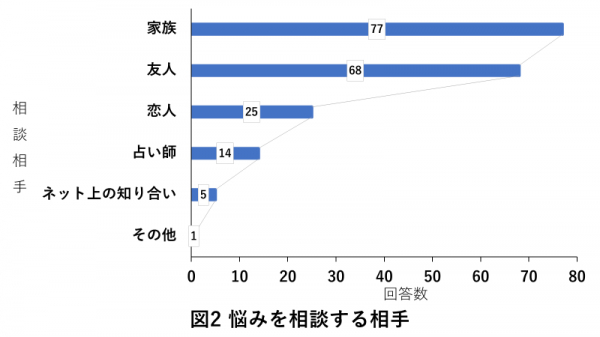 一方、「占い師」に相談するという方はわずか14名。悩みを相談する際は、占い師を含む他人ではなく自分にとって身近な存在に打ち明ける傾向にあるようです。