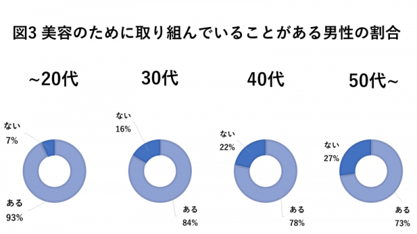 特に、20代までの男性では美容のために取り組んでいることがあると回答した割合は9割以上を占めており、20代までの男性のほとんどが美容に関心を持ちつつ美容に向けて取り組んでいる様子がうかがえました。