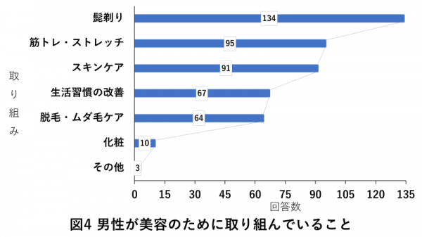 対して、「化粧」に関しては、男性のメイクアップが徐々に馴染みあるものとなってきているものの、今回の調査の中では実際に取り組んでいる男性は少ない結果となりました。