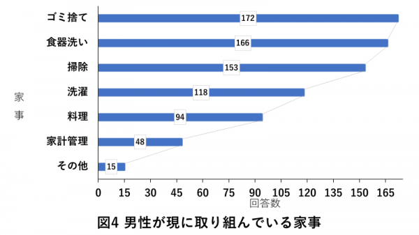 「料理」を行っている男性は比較的少ないものの、調理後の食器洗いに関しては多くの男性が参加しているようです。