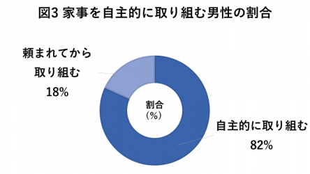 家事に参加していると回答した男性のうち、「自主的に取り組む」と回答した方は8割以上を占めていました。