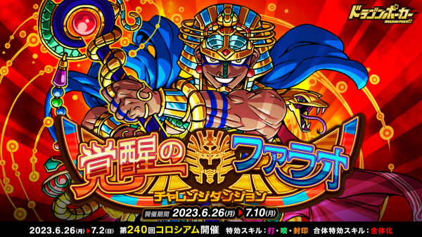株式会社アソビズム(本社:東京都千代田区、代表取締役:大手智之)は、App Store・Google Playにて好評配信中のリアルタイム合体カードバトル『ドラゴンポーカー』で、2023年6月26日(月)より復刻チャレンジダンジョン「覚醒のファラオ」を開催いたします。