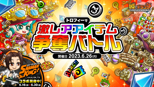 6月26日(月)に、ゲーム内のトロフィー獲得を目指して戦うバトルイベント「トロフィーバトル」が開催されます。今回は、トロフィーに挑み、勝利した際に“ルビー”や“ドラゴンメダル”などが獲得できる「トロフィーで激レアアイテム争奪バトル」を同時開催。“ひとりで”でも“みんなで”でももらえますので、勝利を掴んでたくさんの報酬をゲットしましょう!