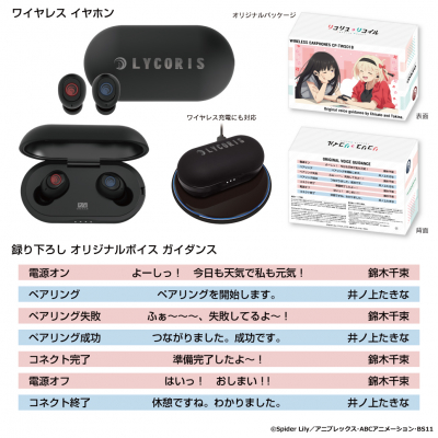 本コラボレーションモデルは、左右ハウジングに「リコリス校章」、充電ケース天面に「LYCORISロゴ」、中面に「DAロゴ」をデザイン。描き下ろしイラストデザインパッケージに、「錦木千束」と「井ノ上たきな」による音声ガイダンス搭載(掛け合いボイス)のコラボレーションモデルとなっております。