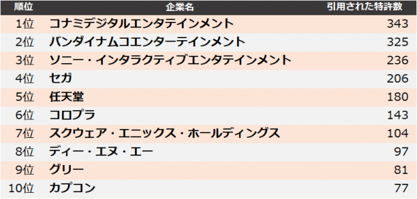 ゲーム・エンターテインメント業界の被引用件数上位30社のランキング